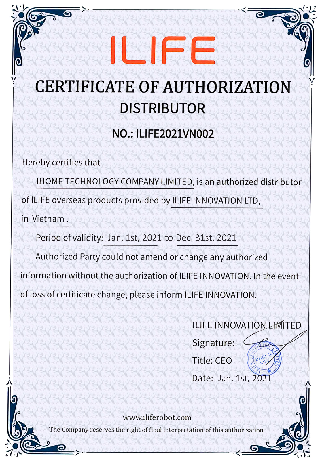 iLife luôn đi đầu về chất lượng, độ thông minh, tính đa năng dịch vụ bảo hành và tính thẩm mỹ của sản phẩm! Đặc biệt, iHome Store hân hạnh được là nhà PHÂN PHỐI CHÍNH HÃNG VÀ DUY NHẤT của ILIFE TẠI VIỆT NAM. Điều đó thực sự có ý nghĩa quan trọng với các khách hàng muốn sở hữu Robot hút bụi lau nhà iLife Quốc tế - phiên bản xuất châu Âu với tiêu chuẩn chất lượng CE kèm hộp và hướng dẫn sử dụng bằng tiếng Anh sử dụng dễ dàng.